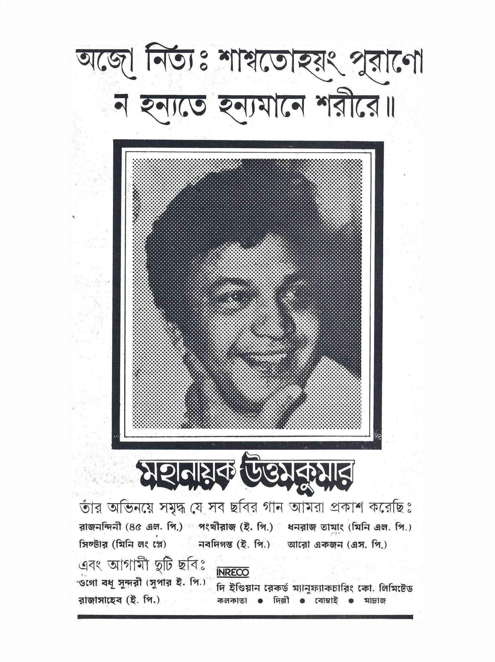 উত্তমকুমারের চলে যাবার পর দি ইন্ডিয়ান রেকর্ড ম্যানুফ্যাকচারিং কো লিমিটেড (INRECO) ১৬ ই আগস্ট ১৯৮০ সালে এই বিজ্ঞাপন টি প্রকাশ করেছিল।